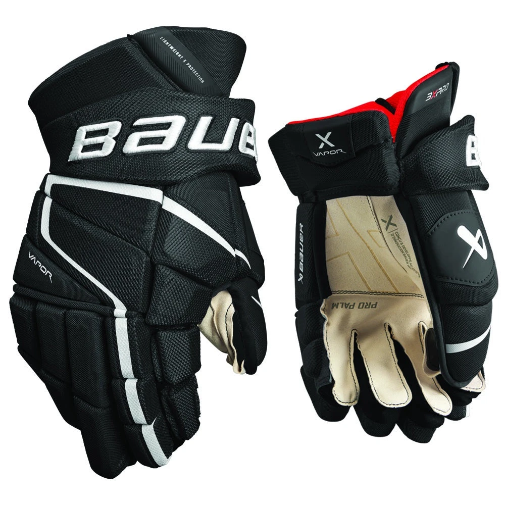 The Vapor 3X PRO Glove is built for the elite stickhandler. The dual-density foam package with HYPERLITE HD & PE inserts throughout provides an elite-level protection package. The 3D raised embroidery logo combined with pro prefered ivory microsuede PRO palm provides a pro-style feel. The comfort of the Vapor 3X PRO is enhanced with the Nanosense liner in the fingers with THERMOMAX+ liner and comfor stretch gusset to keep your hands fresh & comfortable all game long.
